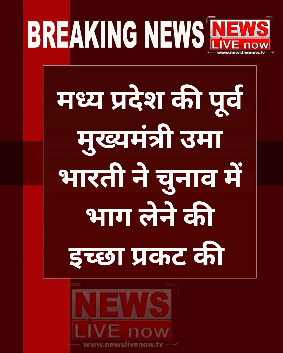 #NewsLiveNow मध्य प्रदेश की पूर्व मुख्यमंत्री उमा भारती ने बुधवार को भोपाल में आयोजित प्रेस वार्ता के दौरान बड़ा बयान दिया। उन्होंने कहा कि उनका मन है कि वर्ष 2029 के लोकसभा चुनाव में वे झांसी से प्रत्याशी बनें। उमा भारती ने कहा, “मैंने पार्टी नेतृत्व को अवगत करा दिया है कि मैं 2029 का चुनाव लड़ने के लिए पूरी तरह तैयार हूं। यदि पार्टी मुझ पर भरोसा जताती है, तो मैं निश्चित रूप से मैदान में उतरूंगी। मेरा इरादा झांसी संसदीय सीट से चुनाव लड़ने का है। इस बार अगर पार्टी मुझसे राय मांगेगी, तो मैं ‘न’ नहीं कहूंगी।”