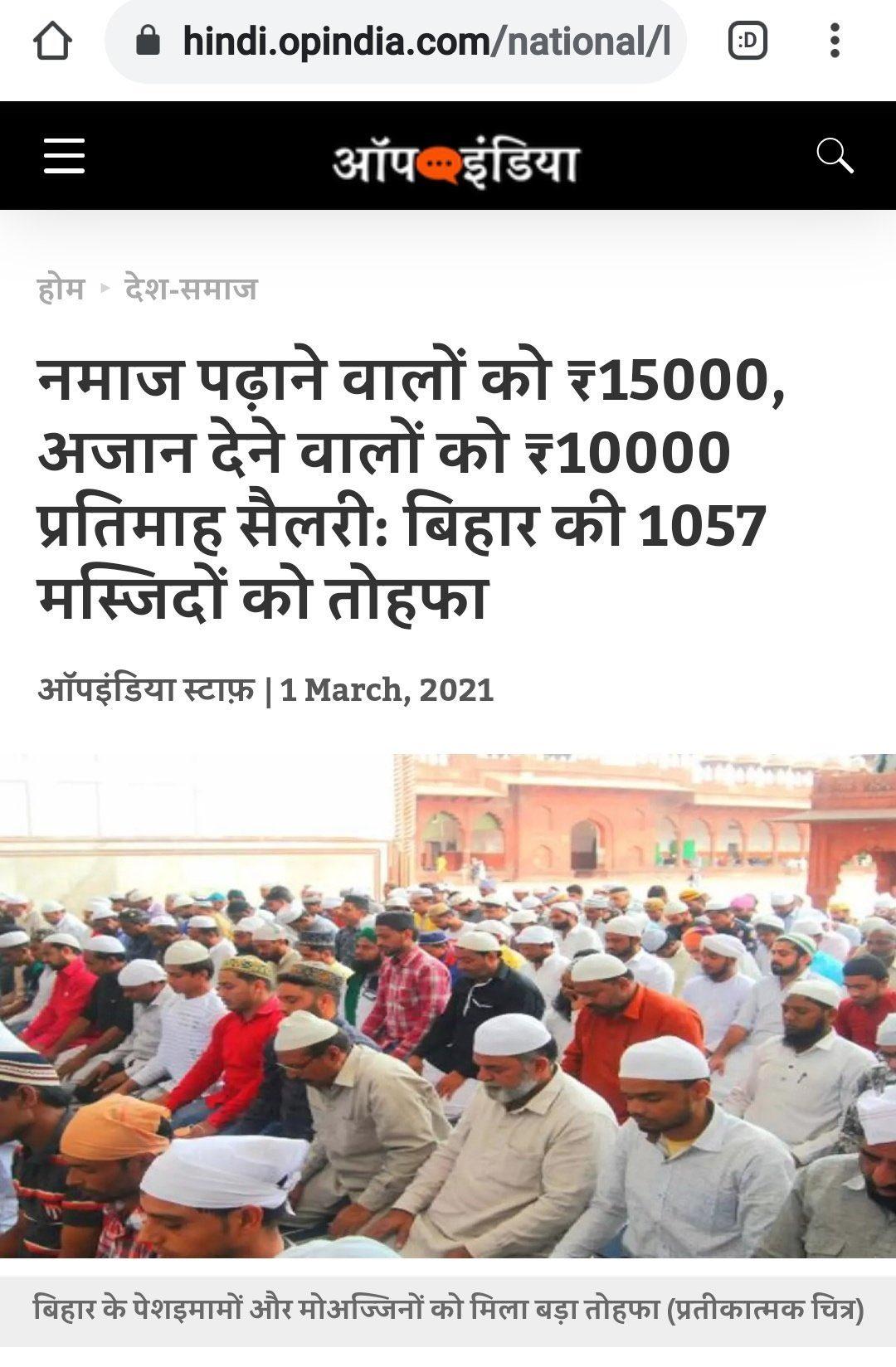 🚨 बिहार के हिंदू सावधान !! 🚨 क्या आप जानते हैं? भाजपा नेतृत्व वाली एनडीए सरकार बिहार में 2021 से नमाज़ और अज़ान पढ़ने वालों को मासिक वेतन दे रही है! 👉नमाज़ पढ़ने वालों को ₹15,000 प्रति माह 👉अज़ान पढ़ने वालों को ₹10,000 प्रति माह 👉यह वेतन 1,057 पंजीकृत मदरसों के कर्मचारियों को एक सरकारी योजना के तहत दिया जा रहा है। याद रखिए: यह भाजपा वाले चुनाव से पहले करेंगे तो बाटेंगे करते हैं, हिंदू मुसलमान करते हैं , चुनाव जीतने के बाद उन्ही मुसलमानों के जेब भर देते हैं, और एक बात .. इसी भाजपा नेतृत्व वाली एनडीए सरकार ने बिहार में हिंदू पुजारियों को एक रुपया तक नहीं दिया! #NDA #muslims #hindu #election #openion #scrolllink
