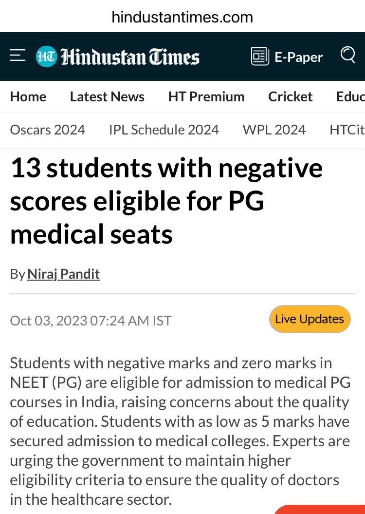 एक मिनट के लिये यदि ये बात भूल भी जाया जाये कि अच्छे नंबर लाने के बावजूद जनरल कैटेगरी के लोग मेडिकल में पीजी सीट से वंचित हैं तो भी ये बात कितनी डरावनी है कि शून्य से कम नंबर लाने वाले लोग चिकित्सा क्षेत्र में “विशेषज्ञ” बने घूम रहे हैं नीम हकीमों से बदतर होंगे ये डॉक्टर, इलाज कराने से पहले डॉक्टर के बारे में पता कर लीजिए #Doctor #Reservation #scrolllink #vaidya