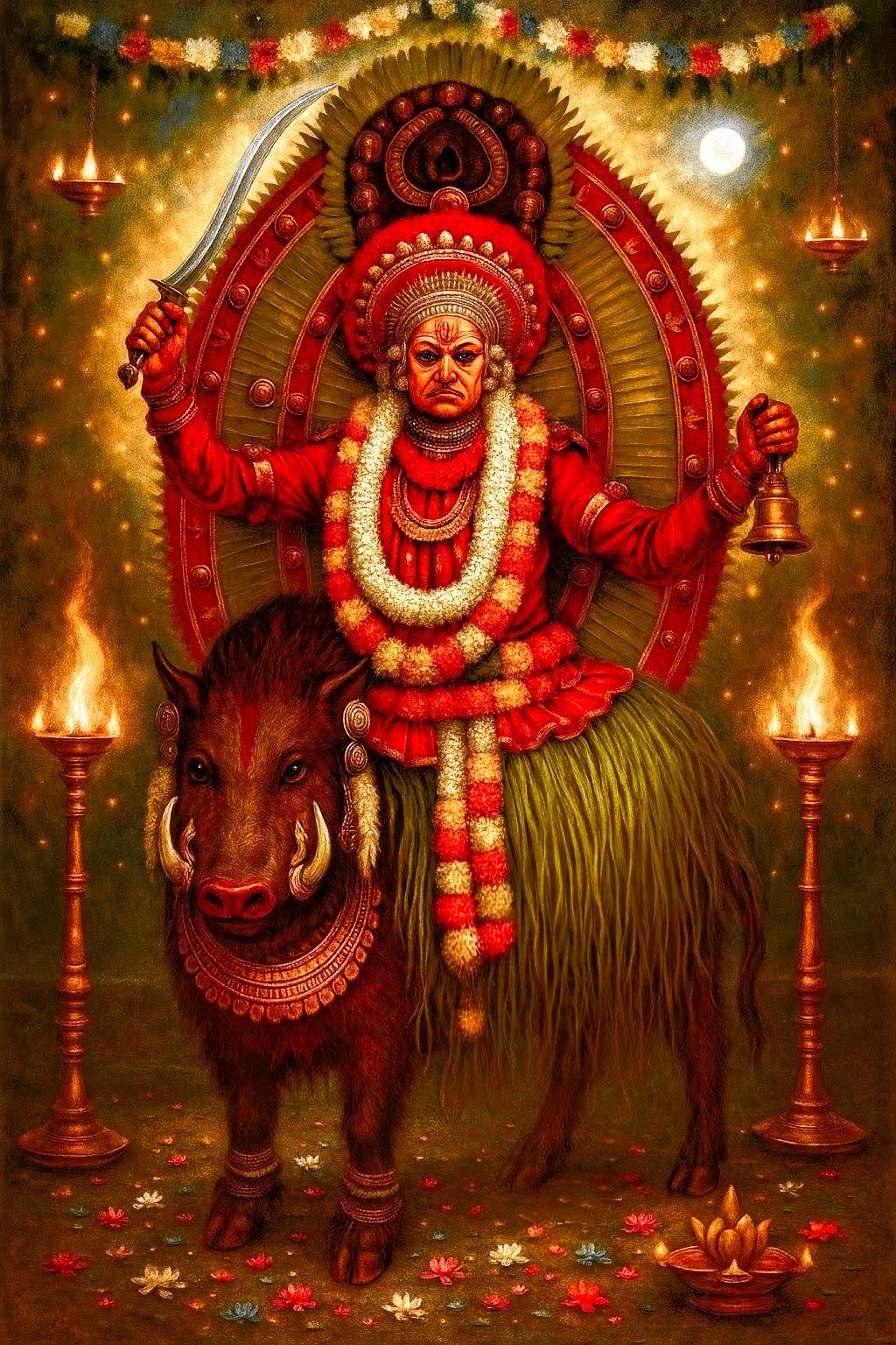 When the drums (Dammamā) begin their frantic, heartbeat rhythm, it is not a call to prayer. It is a summons. The air thickens, heavy with the scent of crushed areca flowers and burning incense. The Paatri, the vessel, is no longer a man. He is a conduit. His body contorts, a puppet to a force that is anything but graceful. It is the brute, grounding shudder of the boar. His dance is not fluid, it is a powerful, stomping, a ritual of claiming territory, of shaking the very foundations of the human world to remind it of the wild one that lies beneath.