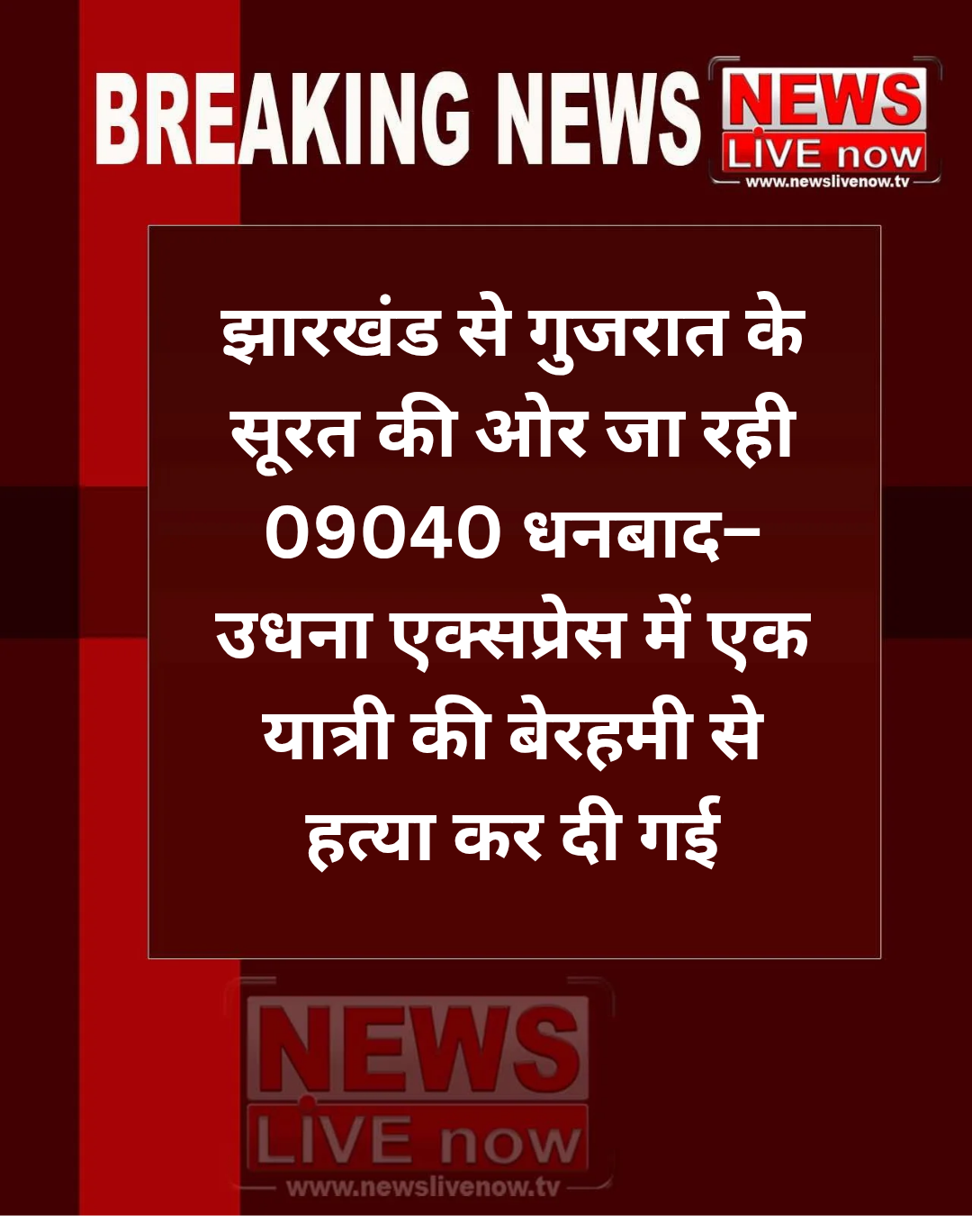 • #NewsLiveNow झारखंड से गुजरात के सूरत की ओर जा रही 09040 धनबाद–उधना एक्सप्रेस में एक यात्री की बेरहमी से हत्या कर दी गई। बताया जा रहा है कि सीट को लेकर हुई कहासुनी के बाद आरोपी ने युवक पर ताबड़तोड़ 54 बार चाकू से वार किया। इस खौफनाक घटना के बाद ट्रेन में अफरातफरी मच गई और यात्रियों में दहशत फैल गई। वारदात के बाद आरोपी मौका पाकर वहां से फरार हो गया।