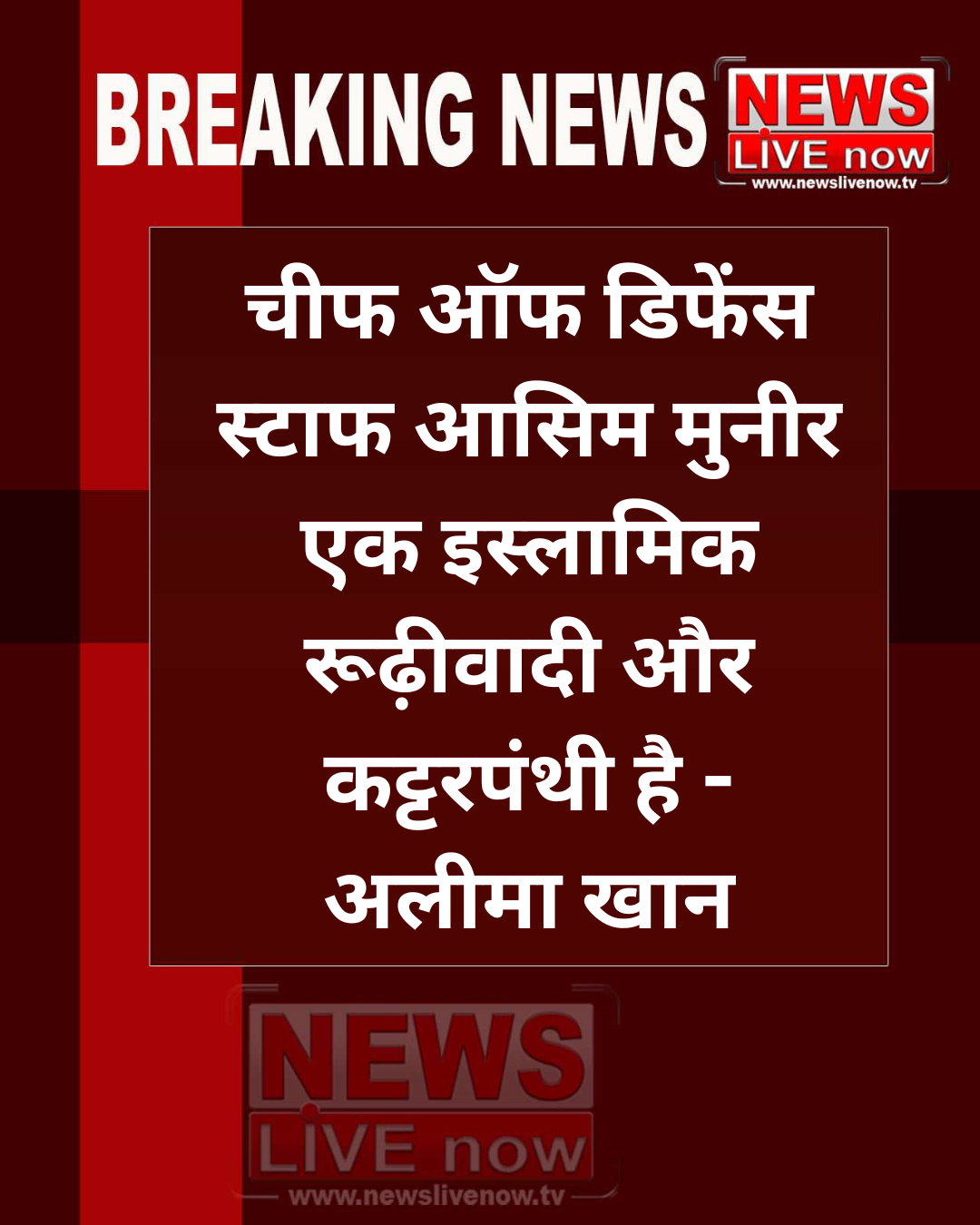 • #NewsLiveNow पाकिस्तान के पूर्व प्रधानमंत्री इमरान खान की बहन अलीमा खान का कहना है की चीफ ऑफ डिफेंस स्टाफ आसिम मुनीर एक इस्लामिक रूढ़ीवादी और कट्टरपंथी है. उनका कहना है की, "आसिम मुनीर भारत से जंग करने के लिए तड़पते हैं, जबकि उनके भाई इमरान खान ने हमेशा पड़ोसी मुल्क के साथ रिश्ते बेहतर करके दोस्ती करने की कोशिश की है."