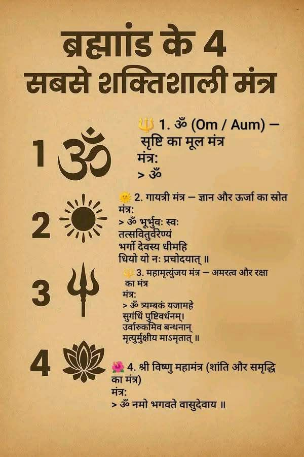 • यहाँ ब्रह्मांड के 4 सबसे शक्तिशाली मंत्र बताए जा रहे हैं, जिन्हें प्राचीन वेदों और शास्त्रों में अत्यंत दिव्य, ऊर्जावान और कल्याणकारी माना गया है।