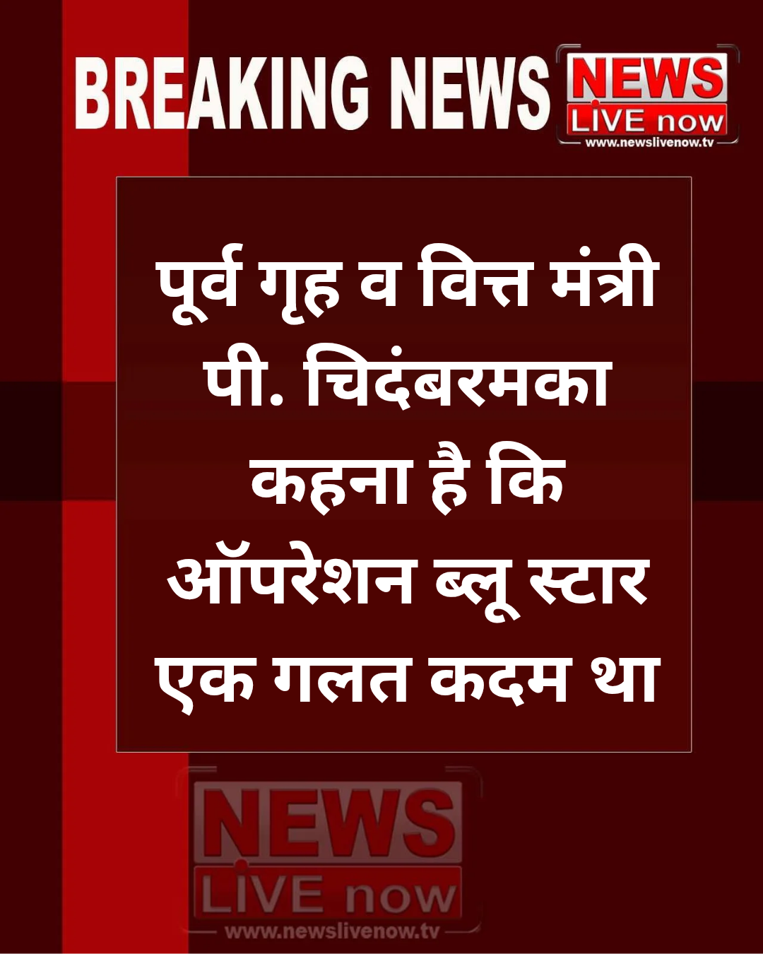 • #NewsLiveNow कांग्रेस के वरिष्ठ नेता और पूर्व गृह व वित्त मंत्री पी. चिदंबरम के एक बयान ने राजनीतिक हलचल तेज कर दी है। शनिवार को चिदंबरम ने कहा कि जून 1984 में अमृतसर स्थित स्वर्ण मंदिर में आतंकवादियों को बाहर निकालने के लिए चलाया गया ऑपरेशन ब्लू स्टार एक गलत कदम था। उन्होंने कहा कि तत्कालीन प्रधानमंत्री इंदिरा गांधी को इस निर्णय की भारी कीमत अपनी जान देकर चुकानी पड़ी। हालांकि, चिदंबरम ने यह भी स्पष्ट किया कि इस घटना के लिए संपूर्ण जिम्मेदारी केवल इंदिरा गांधी पर नहीं डाली जा सकती।
