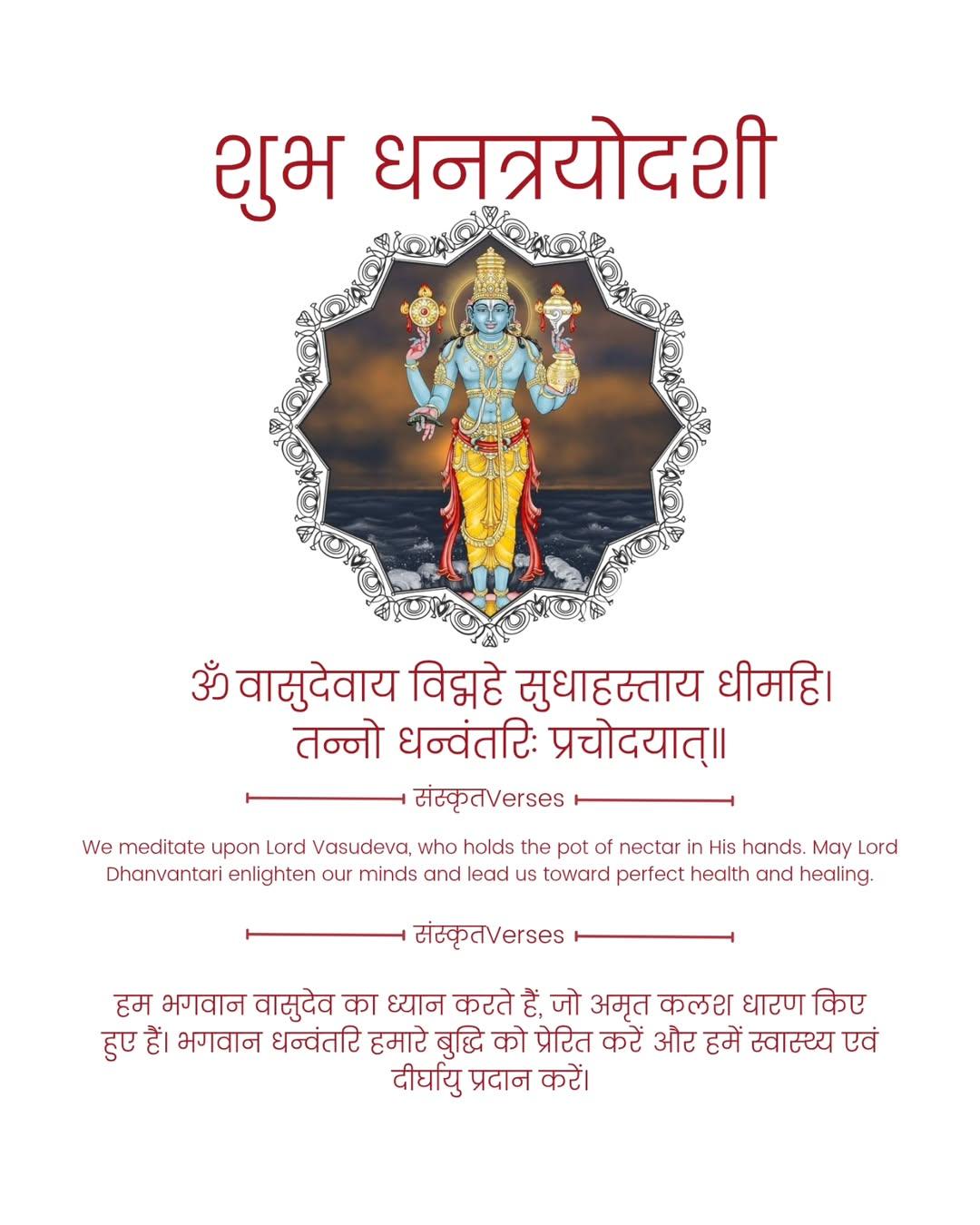 He appeared from the ocean (Samudra Manthan) holding a pot of Amrit (nectar of immortality) — symbolizing health, longevity, and healing.