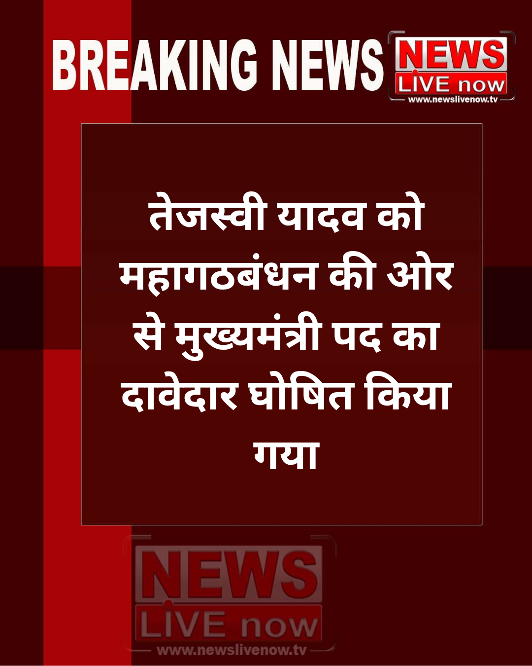 • #NewsLiveNow तेजस्वी यादव को महागठबंधन की ओर से मुख्यमंत्री पद का दावेदार और वीआईपी पार्टी के मुखिया मुकेश सहनी को उपमुख्यमंत्री पद का प्रत्याशी घोषित किया गया है।