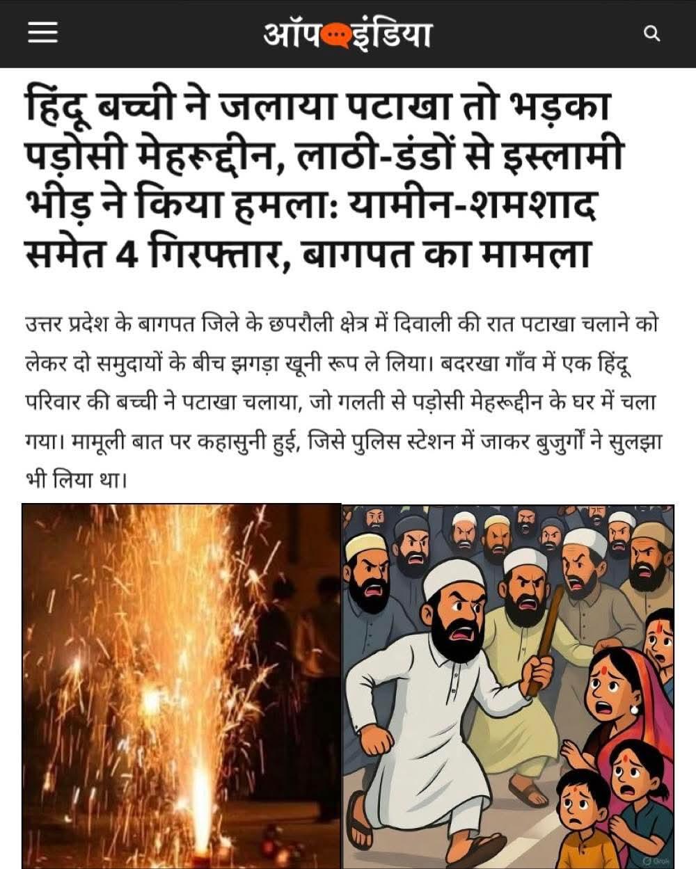इन्होंने मजहब के आधार पर अलग देश क्या इसीलिए बनाया था? जानकारी के अनुसार, 22 अक्टूबर 2025 रात करीब 11 बजे मेहरूद्दीन करीब 25 लोगों के साथ लाठी-डंडों और लोहे की रॉड लेकर हिन्दू जाट प्रवेन्द्र सिंह के घर पहुँचा और परिवार पर हमला कर दिया। इस हमले में प्रवेन्द्र, उनके पिता करण सिंह, माँ जगवती, पत्नी अनिता, भाई अरविंद और भाभी रविता गंभीर रूप से घायल हो गए। करण सिंह का पैर और प्रवेन्द्र की बाजू टूट गई। सभी घायलों का इलाज बड़ौत के आस्था अस्पताल में चल रहा है। मामले का वीडियो भी वायरल हुआ है। पुलिस ने आरोपितों में से यामीन, शमशाद, शबाना और शकीला को गिरफ्तार कर जेल भेज दिया है। बाकी फरार हमलावरों की तलाश जारी है। पुलिस का कहना है कि स्थिति अब नियंत्रण में है और गाँव में शांति बनाए रखने के लिए अतिरिक्त बल तैनात किया गया है। #diwali #muslims #islam #jihadi #hindu #scrolllink
