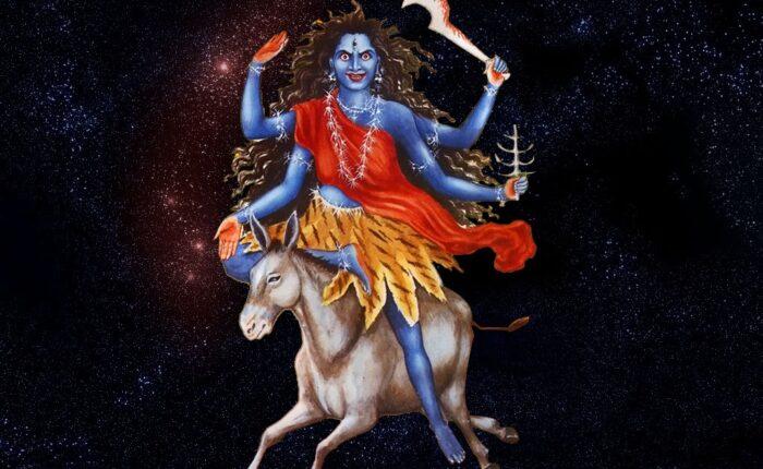 • Kaalratri Devi is the seventh and most fierce form of Goddess Durga, worshipped on the seventh day of Navratri. She is known as the destroyer of ignorance, darkness, and all evil forces. With a dark complexion, disheveled hair, and a blazing aura, she rides a donkey and appears fearsome, yet she radiates immense compassion toward her devotees. She has four hands—two bestowing blessings and protection, and two carrying a sword and a deadly iron hook. Despite her terrifying form, she is lovingly called “Shubankari,” as she grants auspiciousness, fearlessness, and freedom from obstacles. Worshipping Kaalratri Devi is believed to remove negative energies, protect from harm, and lead the devotee toward spiritual awakening and ultimate liberation.’ -Life Unfold.