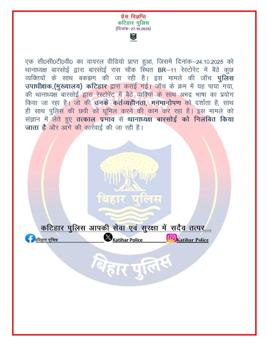 • सोशल मीडिया के ताकत का एक और नमूना देखने को मिला जब कटिहार के भाई बहन से रेस्टोरेंट में बदसलुखी करने के लिए पुलिस वाले को निलंबित कर दिया गया।